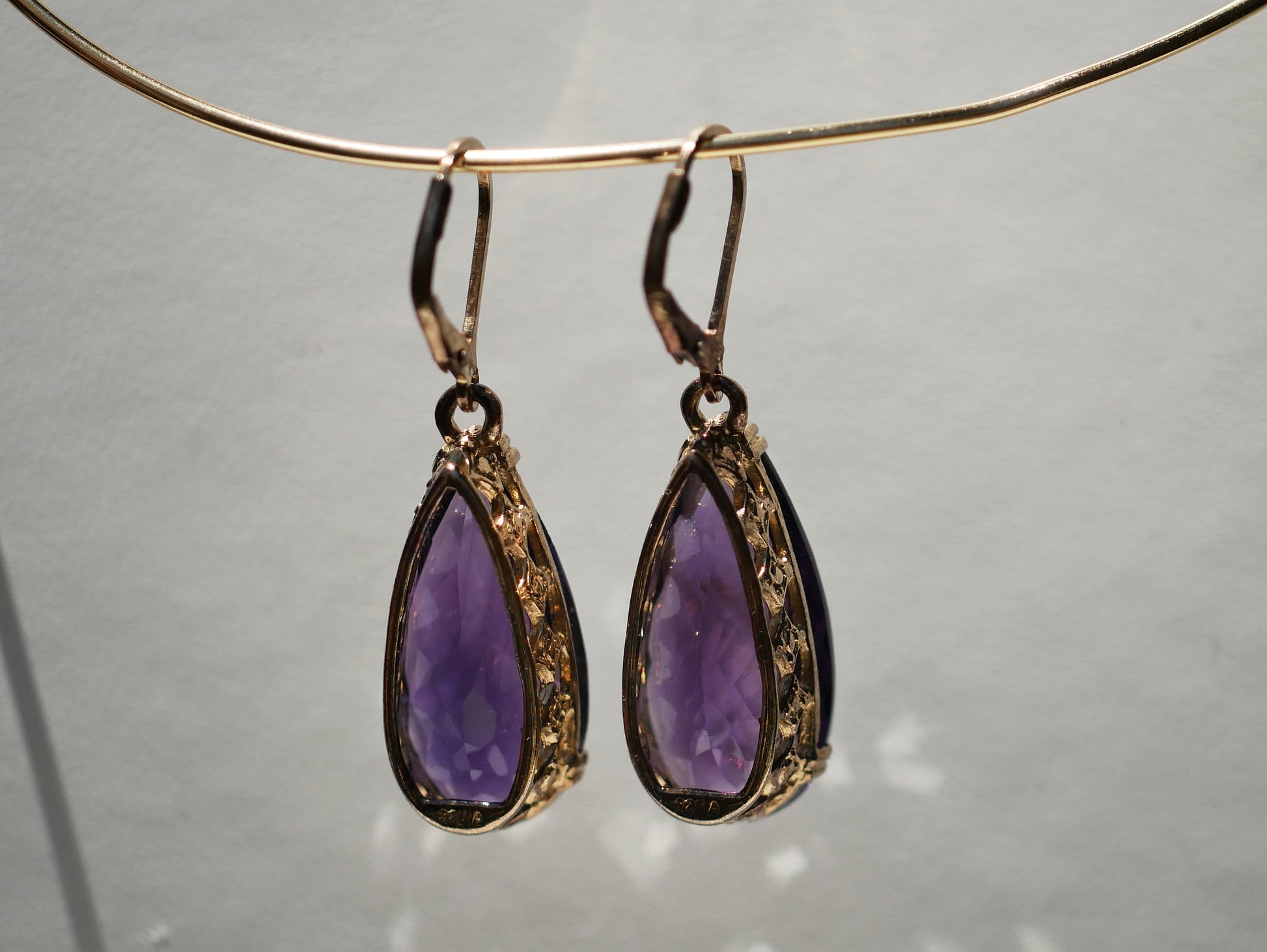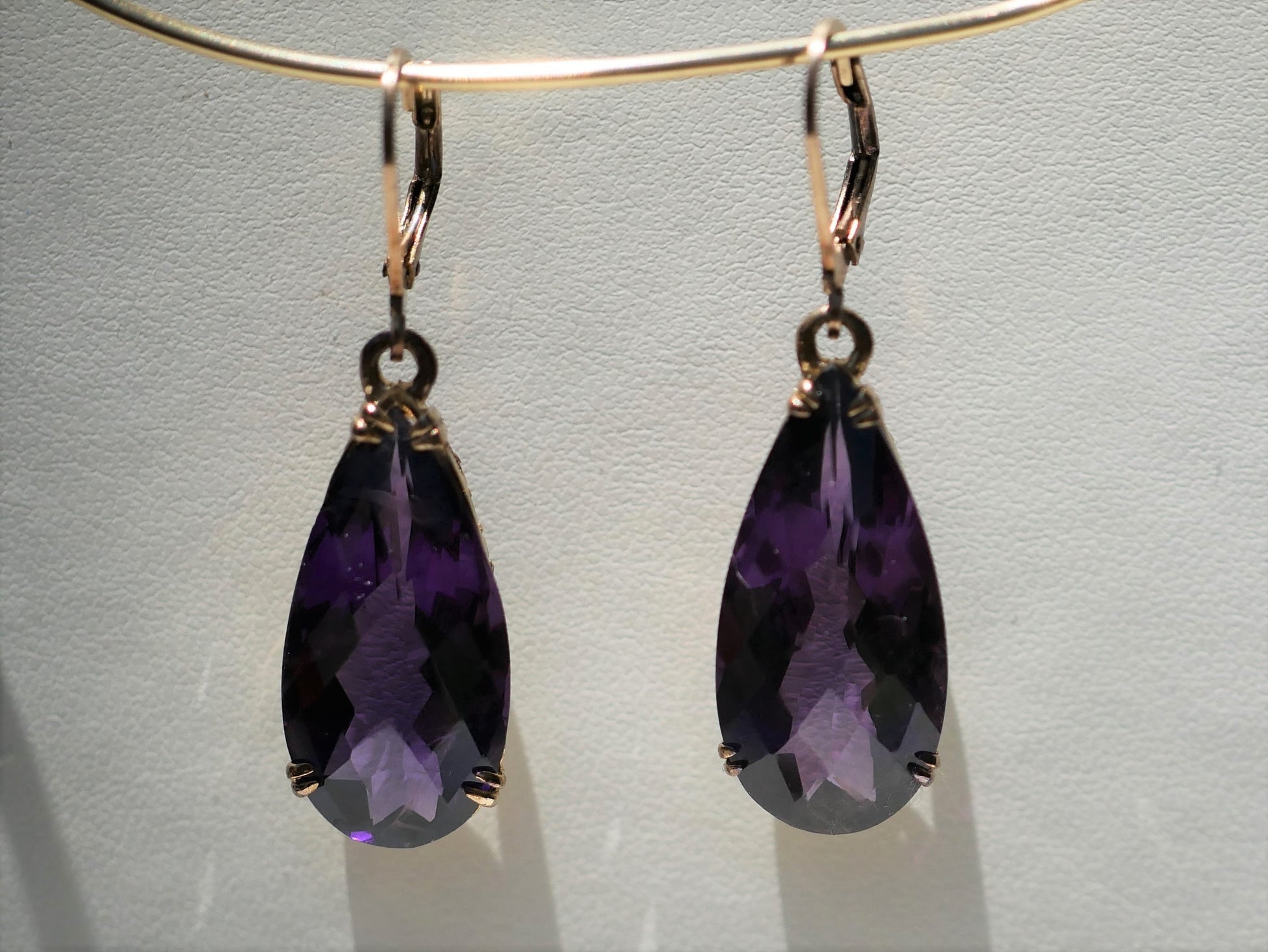 These earrings contain beautiful deep purple African Amethysts. The Amethyst are a pear cut and faceted with lots of sparkle. These are 14 k gold plated over sterling silver. They are about 2 inches in length.