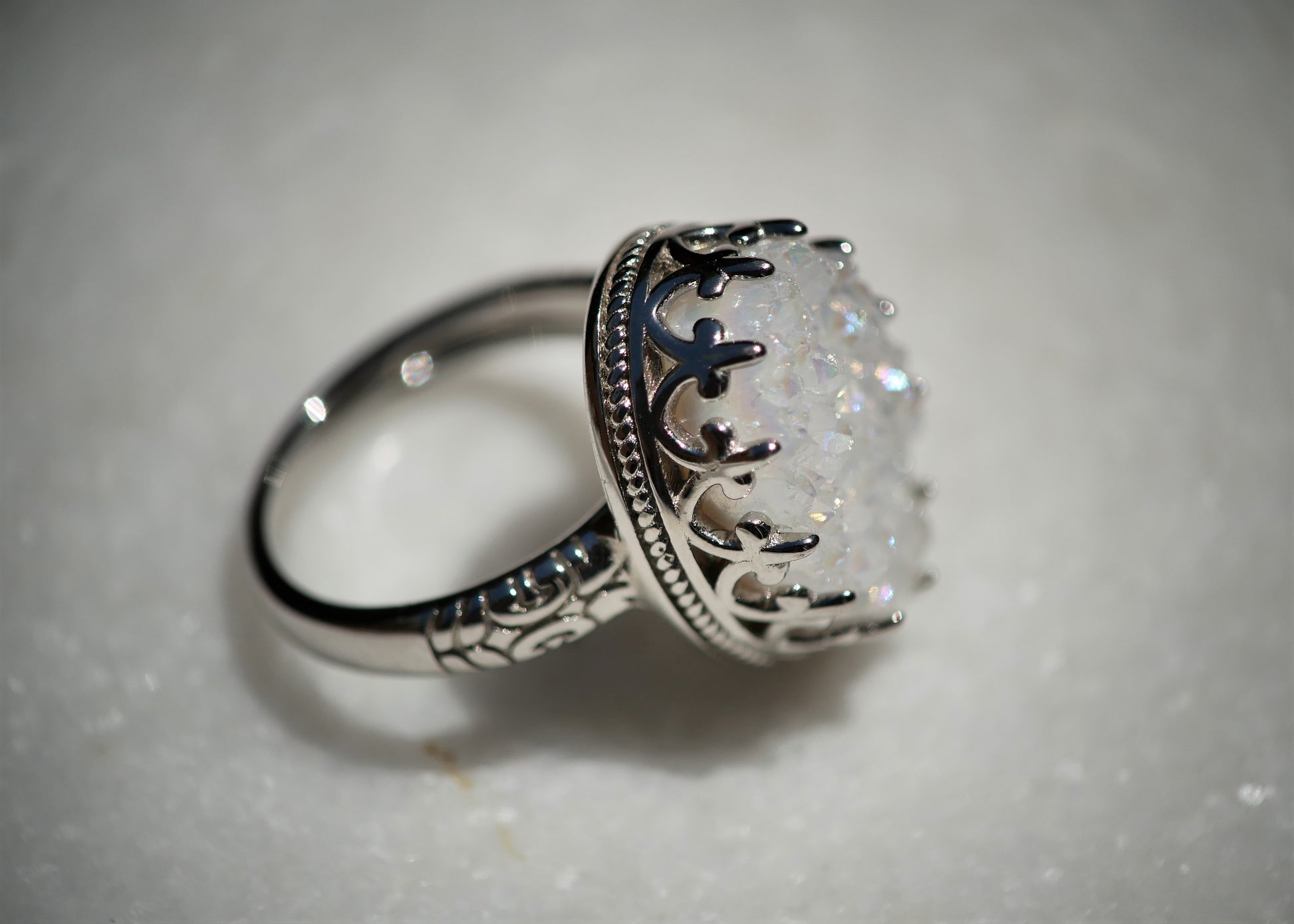 Druzy quartz is a layer of small sparkling crystals that form on the surface of a rock, and is often formed inside geodes. The Druzy white quartz in this ring exhibits a lot of sparkle. This ring is made of sterling silver, and is about 3/4 of an inch in length and 1/2 an inch in width. It is a size 6 but can be resized a maximum of two sizes up or down by a jeweler.