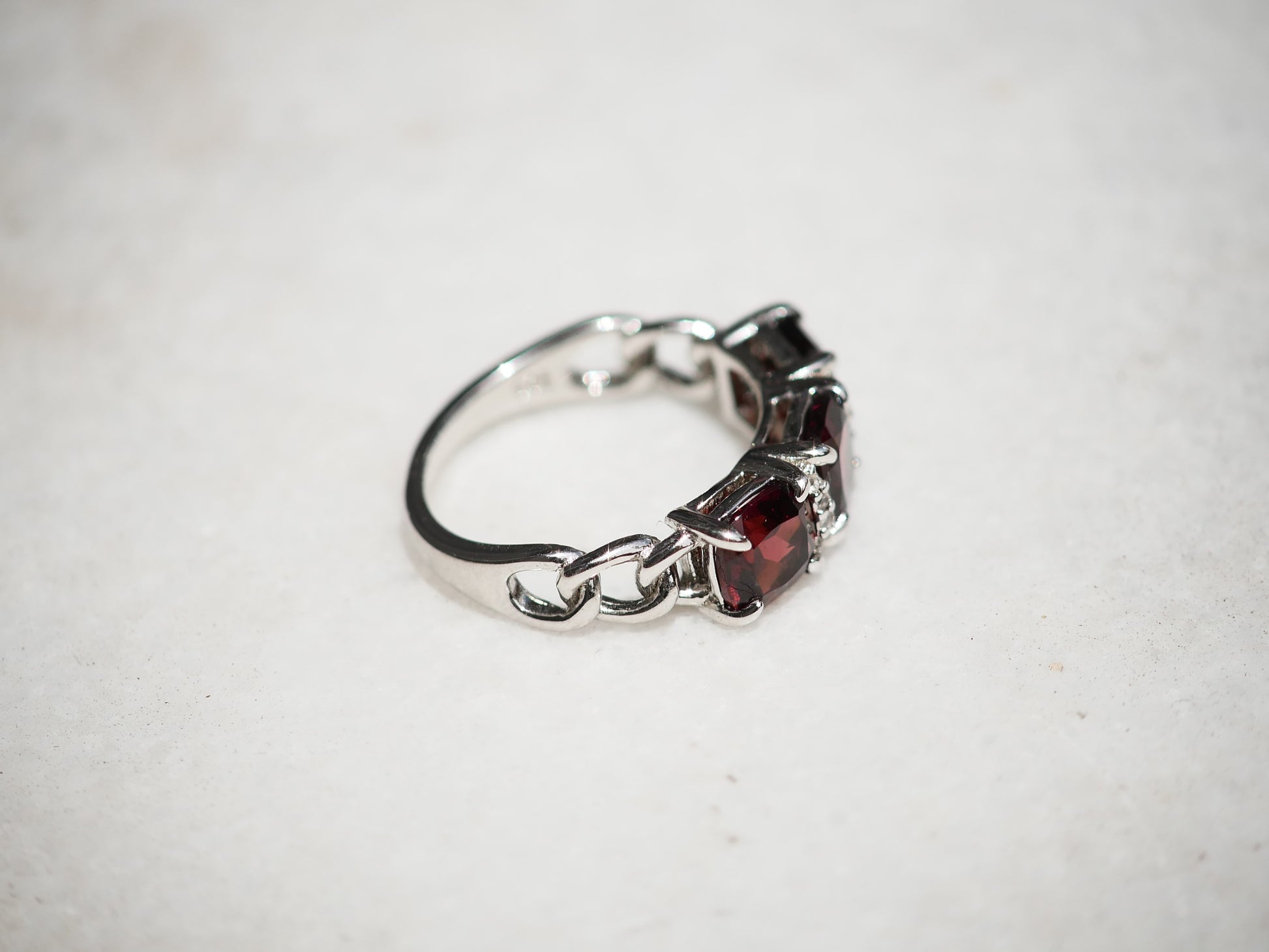 Garnet is a silicate mineral that comes in a variety of colors ranging from red to green to orange. The red of the Garnet in this ring is a deep crimson red. The stones in between the Garnets are white Zircon, which is the oldest mineral on Earth. Garnet is the birthstone for January. This is a three stone ring, which symbolizes the past, present, and future. This ring has a chain link pattern on the sides. This ring is made of sterling silver and is a size 6, but can be resized a maximum of two sizes up or down by a jeweler.