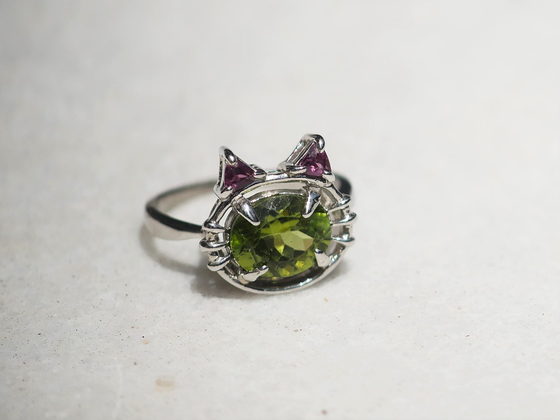 This ring contains Peridot in the center, and the cat ears are made up of Garnets. Peridot is the gem quality variety of the mineral Olivine. Peridot forms deep within the Earth's mantle and travels up to the surface by volcanoes. Peridot is one of the few gemstones that only occurs in one color, a bright green. Peridot is August's birthstone. Garnet is the birthstone of January. This ring is made of sterling silver and is a size 7. It can be resized up or down two sizes by a jeweler. It is about 1/2 an inch in length and 1/2 an inch in width.