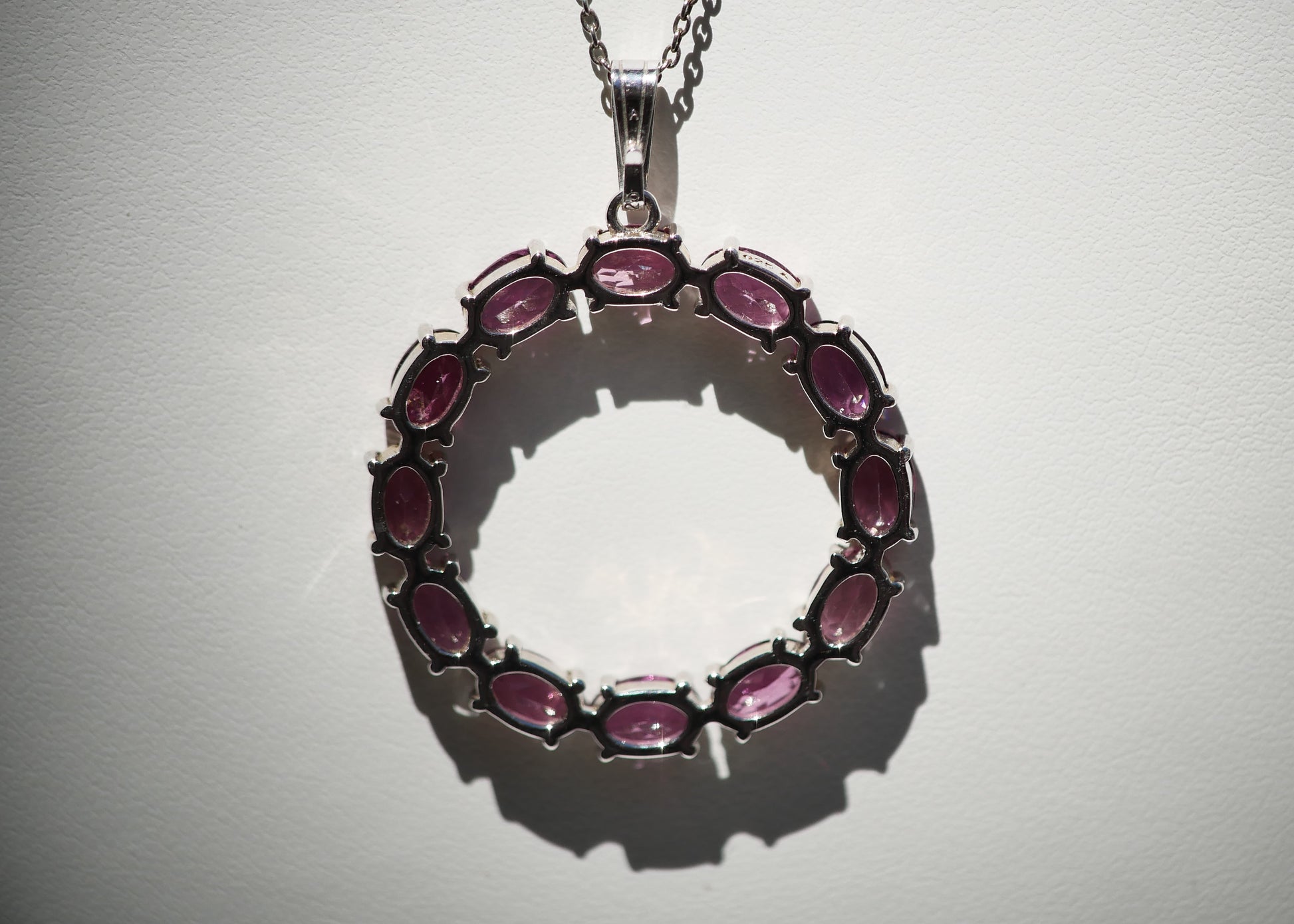 Garnets come in many colors from red to green to orange, and Rhodolite is a variety of Garnet that is rose pink-to red color. The name comes from the Greek word "rhodon" which means "rose-like". There are 12 Rhodolite's in this circle necklace. The circle symbolizes eternity, wholeness and unity. Garnet is the birthstone of January. This pendant is 1 1/2 inches in length, and comes on an 18 inch sterling silver chain.