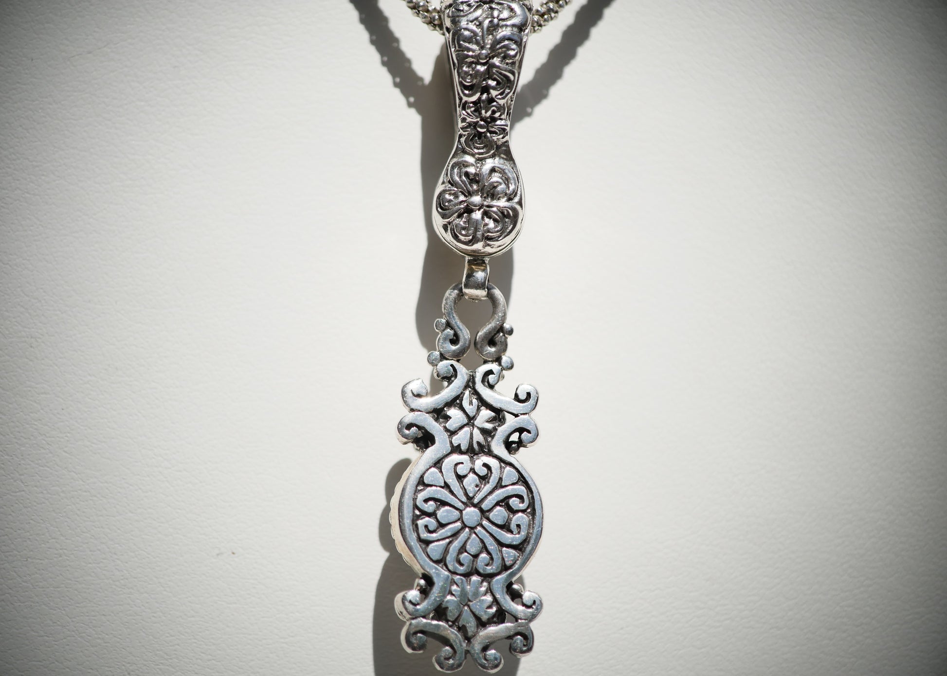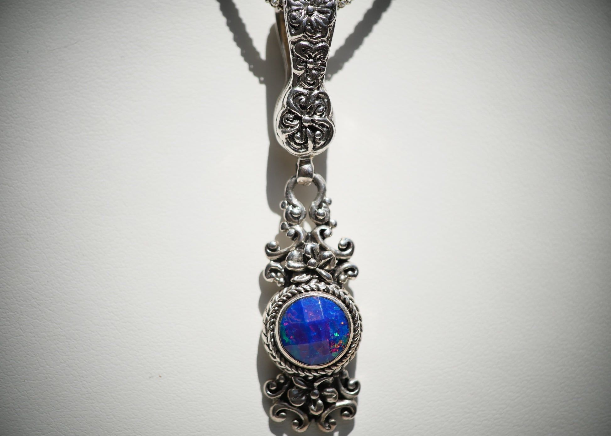 This is a lab grown blue Opal. Lab grown minerals/gemstones have the same properties as the natural stone, so in a laboratory this would test as an opal. This blue opal has great play-of-color with flashes of red, green, and orange. This pendant is beautifully detailed and hand crafted in Bali Indonesia. It is 2 inches in length and 1/2 inch in width. This pendant does not come with a chain, but has a magnetic enhancer bail so it can be put on any chain you may have.
